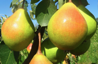Плоды: 120-140 г, правильной грушевидной формы. Окрас зрелых плодов - нежно-желтый с ярким малиново-красным румянцем.