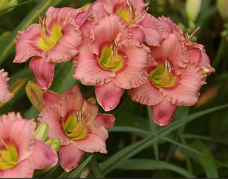 Нежно-розовый с красным глазком и зеленым горлом, ароматный, повторное цветение, высота 65 см.